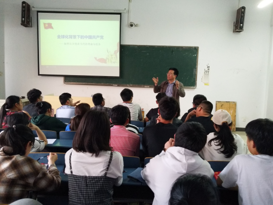 高其文老师围绕“全球化背景下的中国共产党”的主题展开讲授,从人类的发展史切入到中国特色社会主义发展历程及发展设想;由人类文明发展史引入到党的指导思想发源点;从世界局势讲到国内局势逐渐引导同学们理解党在这一局势下的使命与任务,明白中国社会所处的历史方位。从历史、政治等方面循序渐进的让同学们意识到他们的责任和使命。最后,高其文老师解析了我国历届国家领导人的经历及成就,并希望同学们能够铭记历史,不忘国耻,不忘初心,砥砺前行。