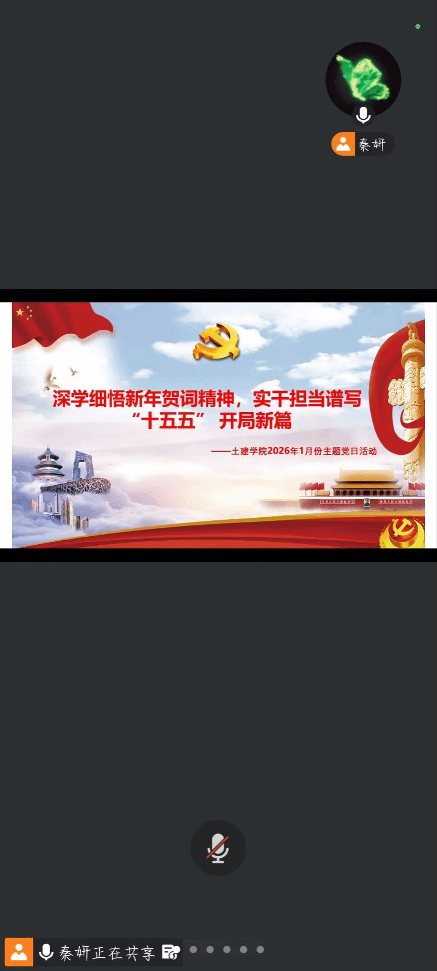(通讯员 张亚兰)2026年1月29日18点30分,土木工程与建筑学院学生党支部在腾讯会议线上开展以“深学细悟新年贺词精神,实干担当谱写‘十五五’开局新篇”为主题的主题党日活动。
